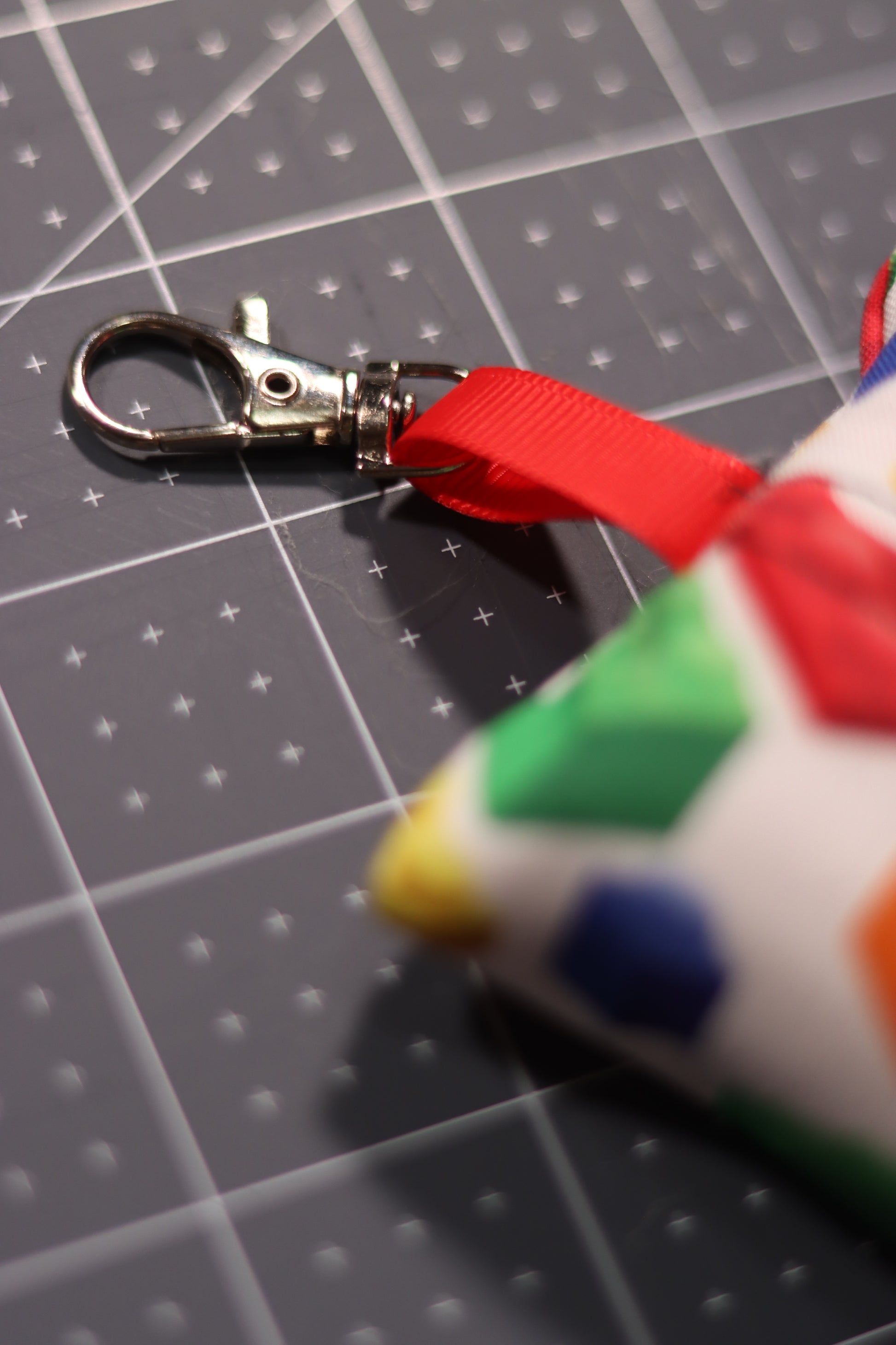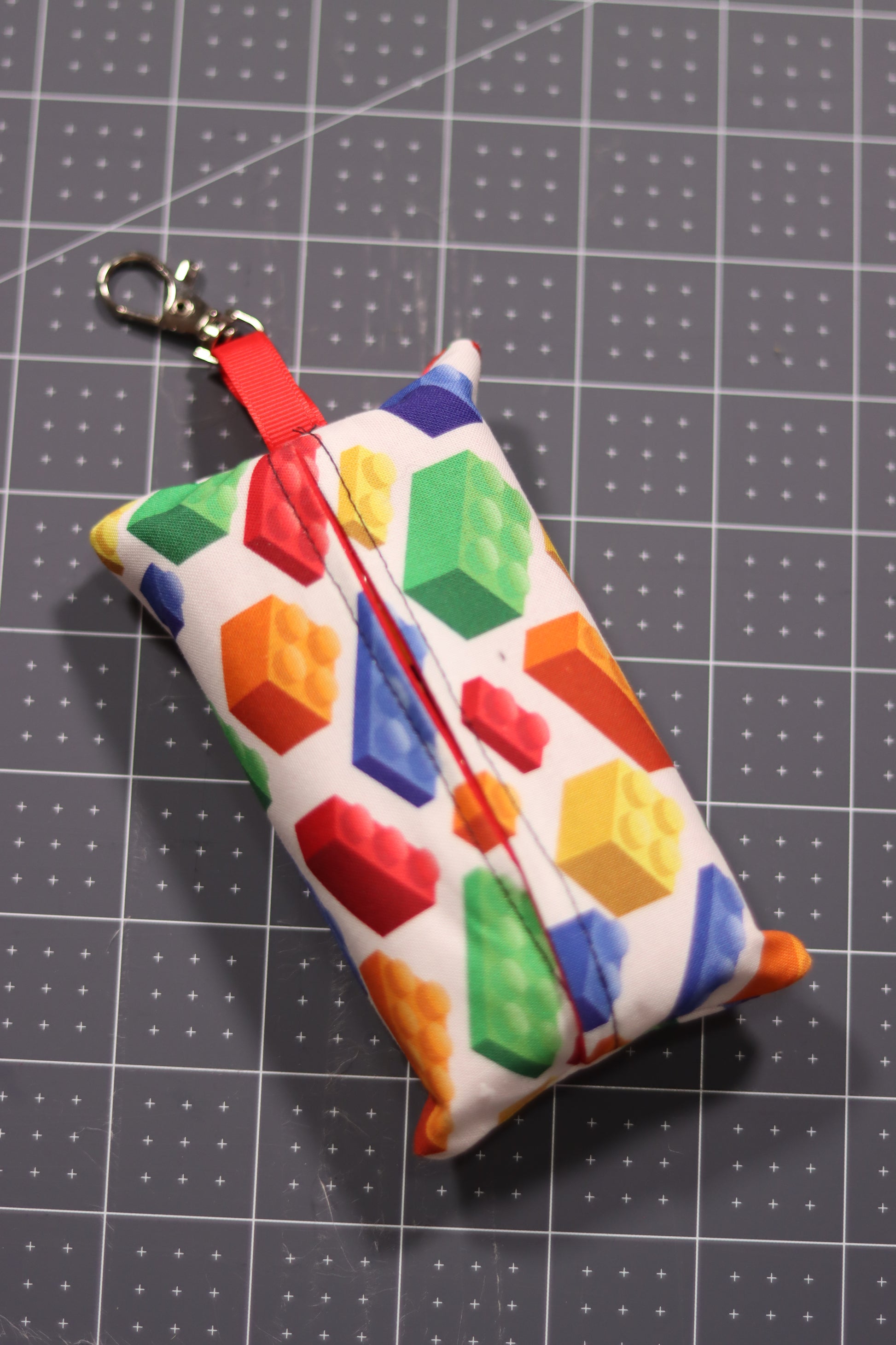 Handmade with love, this tissue pouch is made from woven fabric, grosgrain ribbon, and a metal swivel hook for attaching to purses, backpacks, or bags.