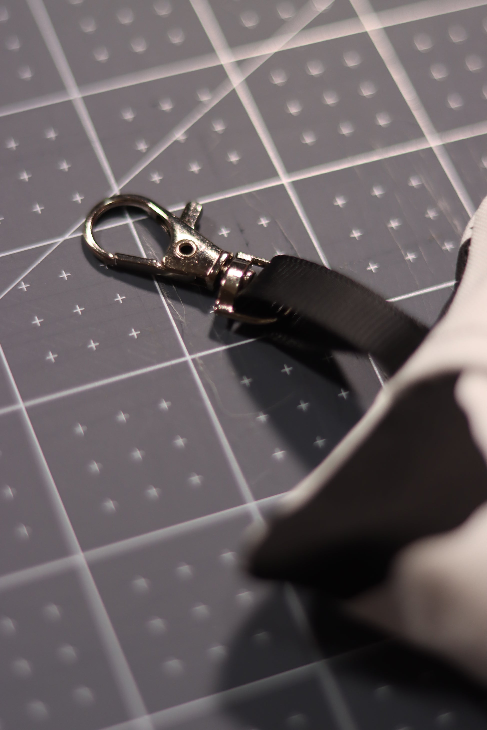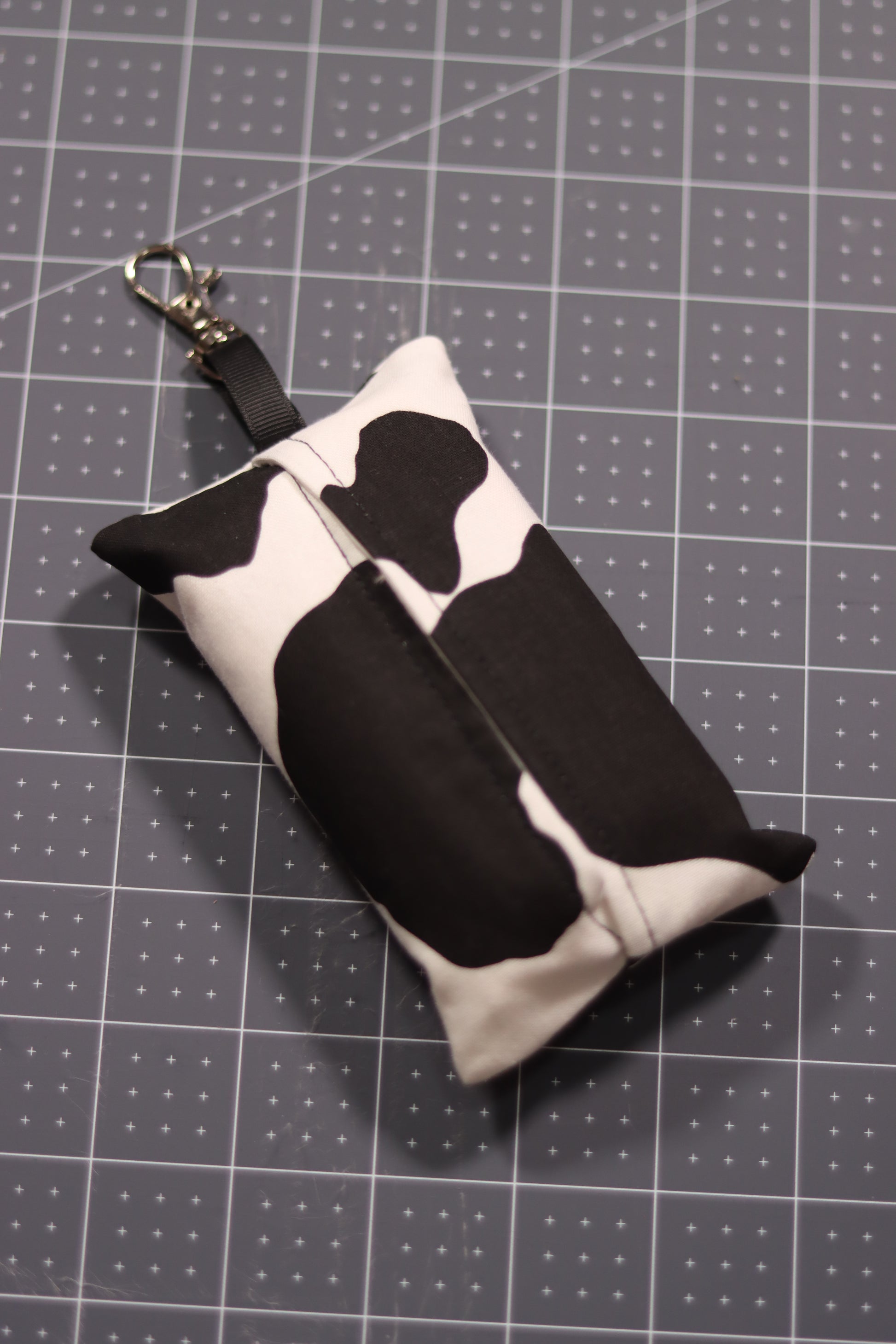 Handmade with love, this tissue pouch is made from woven fabric, grosgrain ribbon, and a metal swivel hook for attaching to purses, backpacks, or bags.
