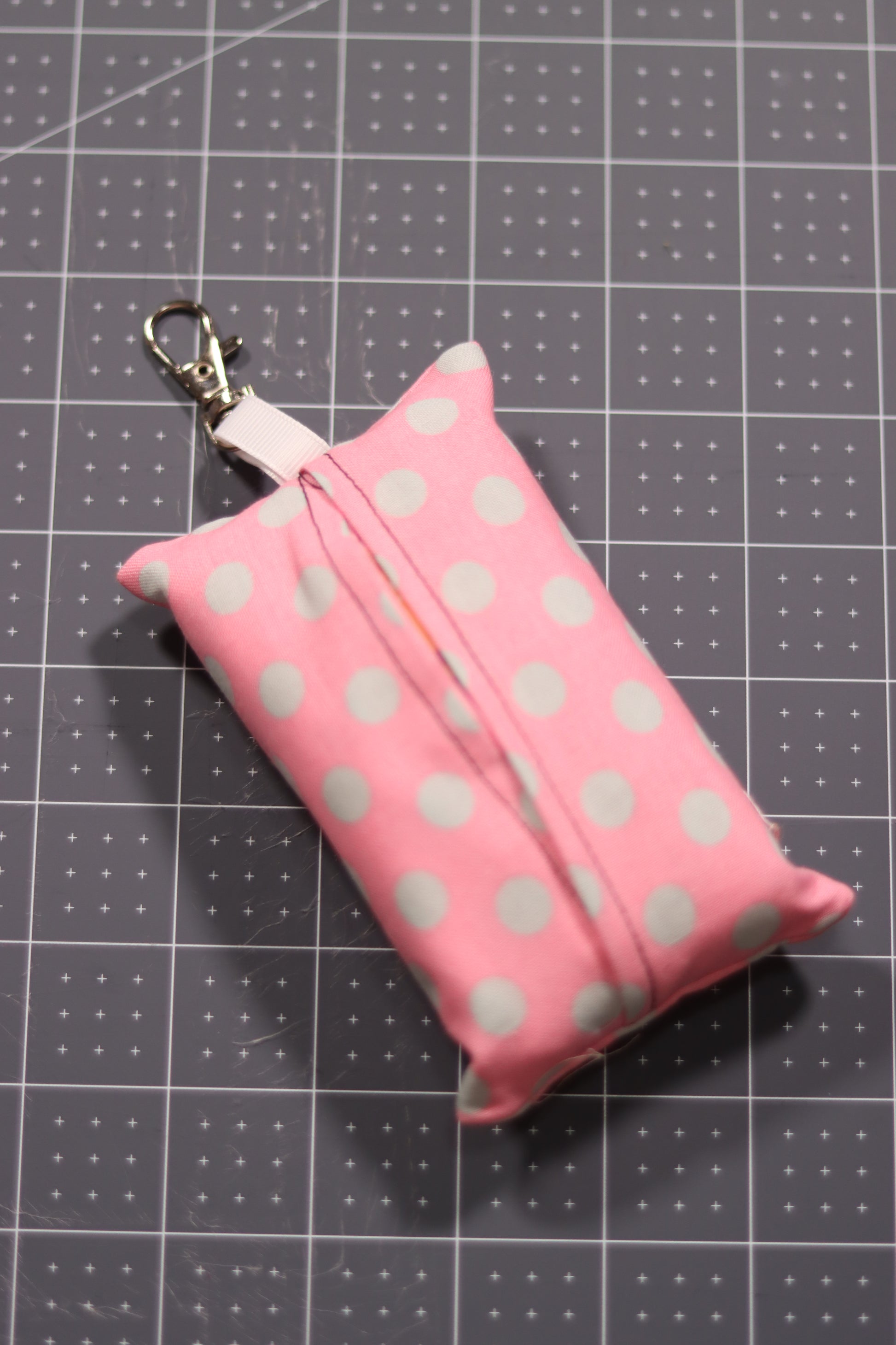 Handmade with love, this tissue pouch is made from woven fabric, grosgrain ribbon, and a metal swivel hook for attaching to purses, backpacks, or bags.